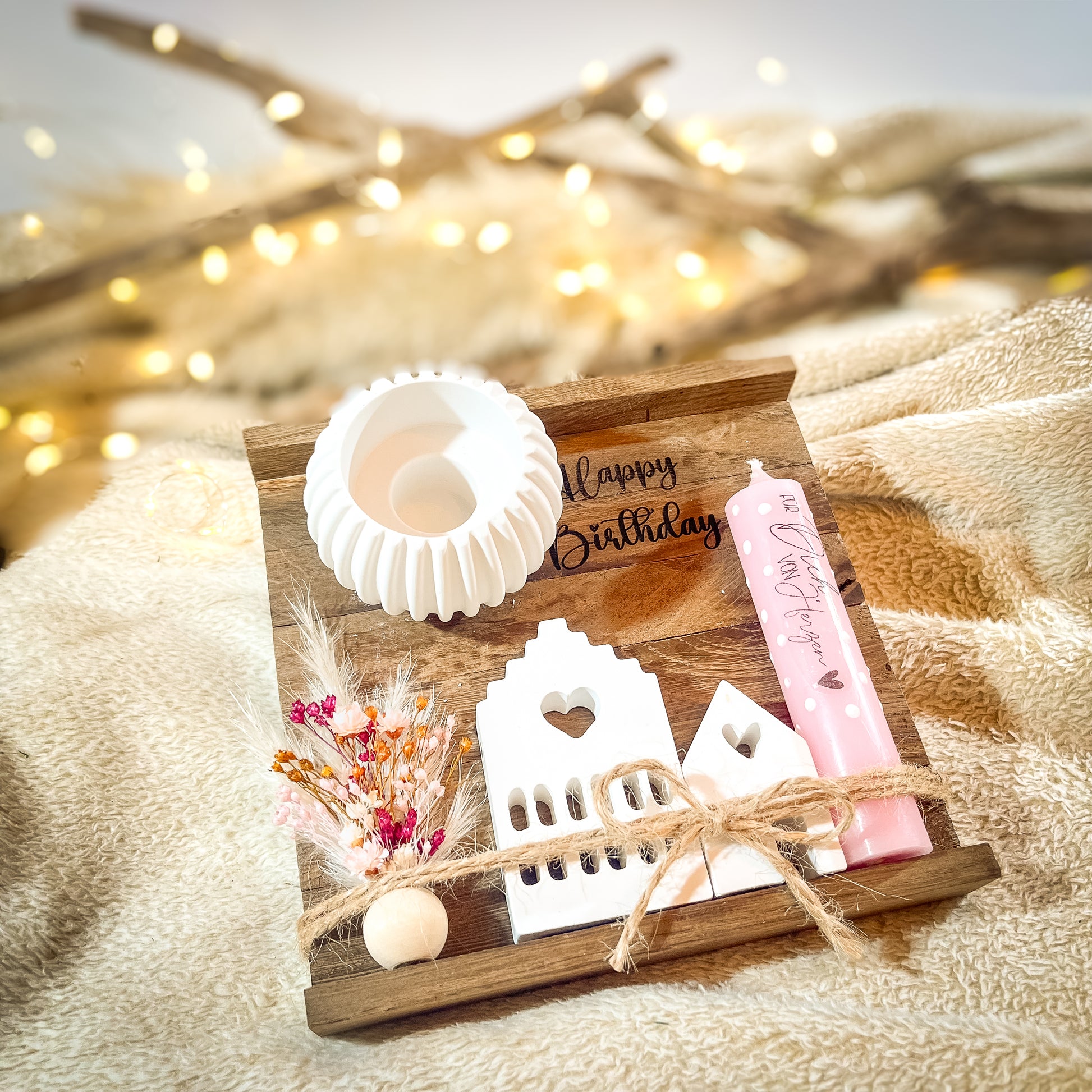 Unser Geburtstagsgeschenk, aus hochwertigen Keraflott, handgegossen und schön dekoriert auf einem Holzbrett mit besteht aus einer hochwertigen Kerze, einem 2in1 Kerzenhalter für Teelichter und Stabkerzen, einem kleinen Blumenstrauß und zwei Lichthäusern.