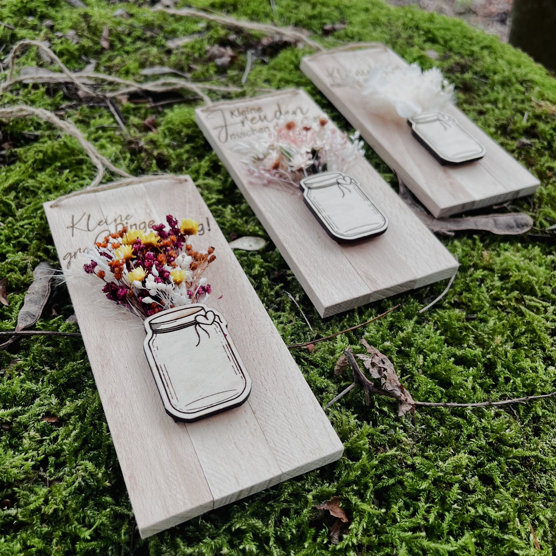 Dieses wunderschöne, gelaserte Dekoschild ist das perfekte kleine Mitbringsel/Dankeschön um Ihren Liebsten eine Freude zu bereiten. Mit einer Auswahl an drei inspirierenden Sprüchen, die sorgfältig auf langlebiges Holz gelasert sind, bringt es positive Botschaften in jedes Zuhause. Die filigrane Verzierung durch eine gelaserte Vase, ergänzt durch zauberhafte Trockenblumen in drei verschiedenen Farben, verleiht dem Schild eine einzigartige und persönliche Note.