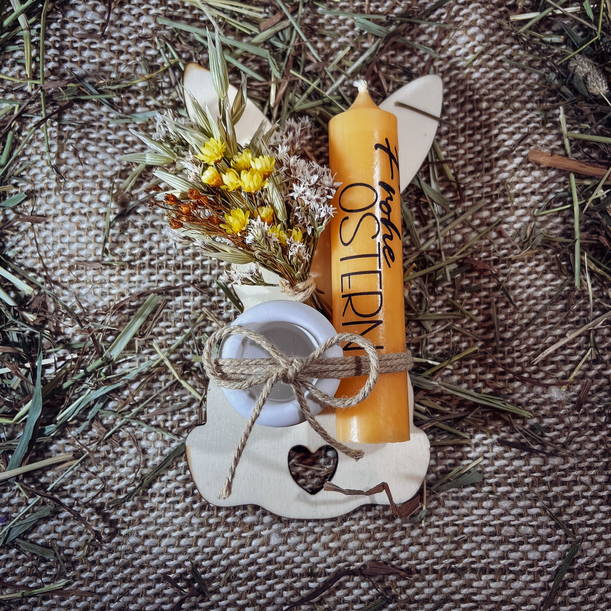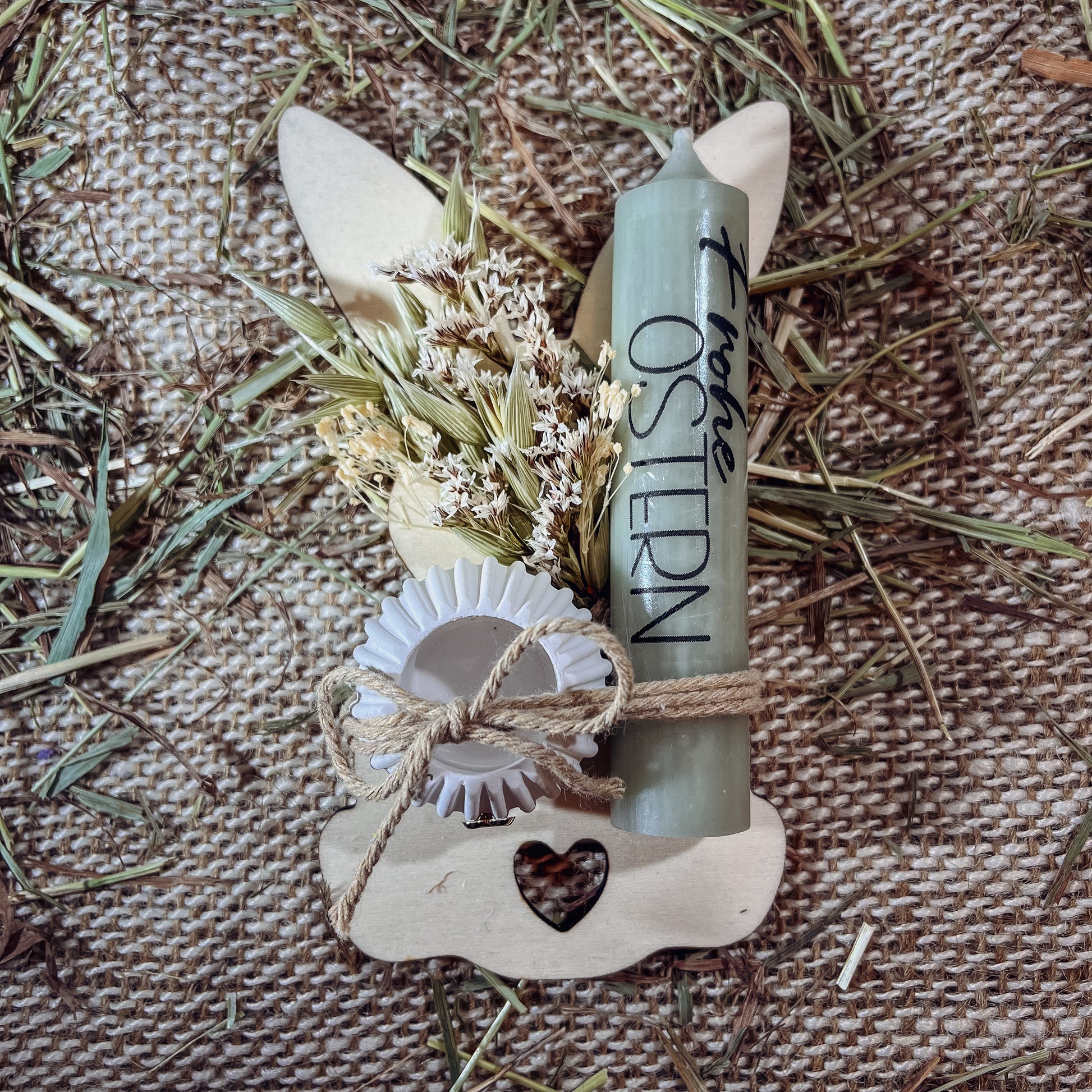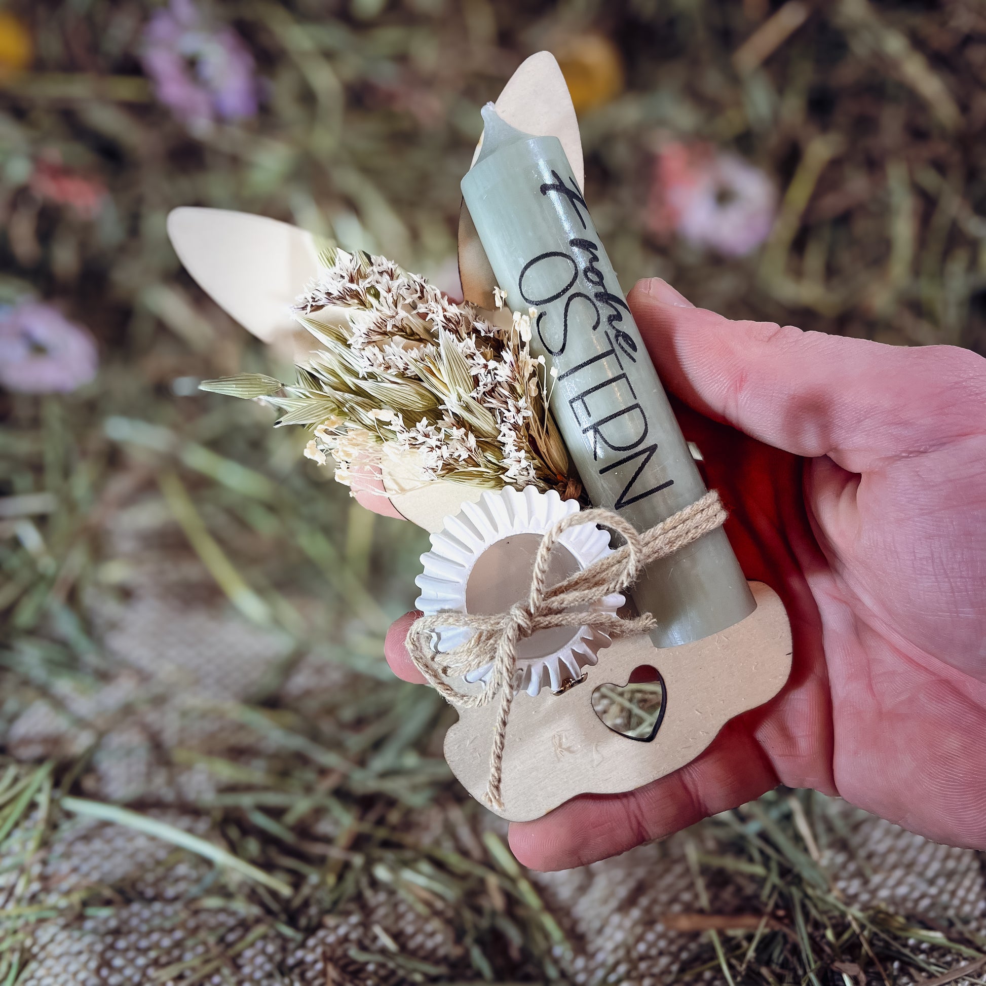 Ein süßer Osterhase aus Holz dient als Unterlage für diese schönen Stabkerzen und Blumensträuße aus hochwertigen Trockenblumen. Abgerundet wird das ganze mit einem Kerzenhalter deiner Wahl. Entweder ein geriffelter Halter mit goldenem Herz oder einen glatten Kerzenhalter mit schwarzem Herz. Die Stabkerze ist klassisch mit "Frohe Ostern" beschriftet. Jedes unserer Produkte ist handgefertigt und kann daher leicht vom Musterfoto abweichen. Unregelmäßigkeiten und Farbschattierungen in der Oberflächenstruktur sowie kleine Luftbläschen sind gießtypisch und machen jedes Objekt zu einem Unikat. Das ist kein Qualitätsmangel oder Reklamationsgrund. Die Dekoration auf dem Foto sind nur Dekorationsbeispiele und gehören nicht zum Lieferumfang. Der Blumenstrauß am Kerzenhalter kann je nach Verfügbarkeit etwas vom Produktfoto abweichen. Dies ist kein Reklamationsgrund. Sicherheitshinweise: - bei den aus Keraflott hergestellten Artikeln besteht Bruchgefahr - bei beschädigten Artikeln besteht an den abgeplatzten Stellen Verletzungsgefahr/Schnittgefahr/Verschluck-/Erstickungsgefahr - bei Artikeln die mit Jutegarn / Trockenblumen dekoriert sind, besteht Brandgefahr - bei längeren Bändern besteht Strangulationsgefahr - Holz ist ein Naturprodukt & kann Splitter aufweisen - Produkte sind nicht witterungsbeständig und nur für den Innenbereich geeignet - Kleinteile, lange Bänder & Kerzen außer Reichweite von Kindern/ Haustieren aufbewahren !Erstickungsgefahr, Strangulationsgefahr & Brandgefahr! Kerzenhinweise: - Kerzen niemals unbeaufsichtigt brennen lassen - nicht in der Nähe von brennbaren Gegenständen anbrennen - Kerzen gehören nicht in Kinderhande/ vor Haustieren sichern - nicht in Zugluft stellen - einen aufrechten und sicheren Stand vor dem Anzünden gewährleisten - Dekoration wie Trockenblumen vor dem anzünden entfernen. Herstellerinformationen: L. Kleverbeck - Köthener Straße 38 - 06369 Görzig - Deutschland Tel.: 01512 8767792 Mail: yourthreeminds@gmail.com