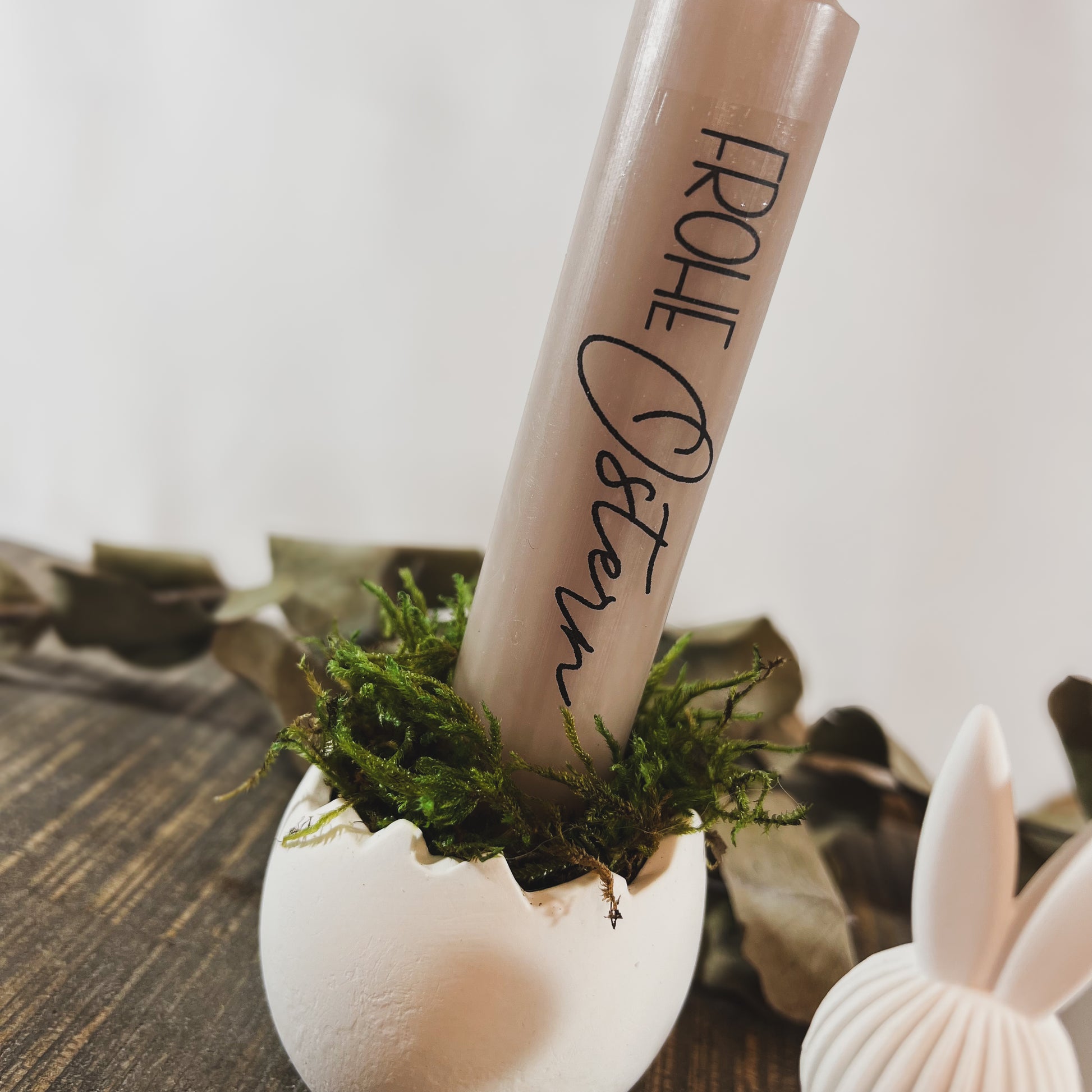Süßer Kerzenhalter in Form von einem Osterei mit einem Osterhasen aus hochwertigem Keraflott. Handgegossen, schön dekoriert mit einer Stabkerze und wunderschönen Trockenblumen. Die Stabkerze ist zudem noch schön beschriftet. Jedes unserer Produkte ist handgefertigt und kann daher leicht vom Musterfoto abweichen. Unregelmäßigkeiten und Farbschattierungen in der Oberflächenstruktur sowie kleine Luftbläschen sind gießtypisch und machen jedes Objekt zu einem Unikat. Das ist kein Qualitätsmangel oder Reklamationsgrund. Die Dekoration auf dem Foto sind nur Dekorationsbeispiele und gehören nicht zum Lieferumfang. Der Blumenstrauß am Kerzenhalter kann je nach Verfügbarkeit etwas vom Produktfoto abweichen. Dies ist kein Reklamationsgrund.