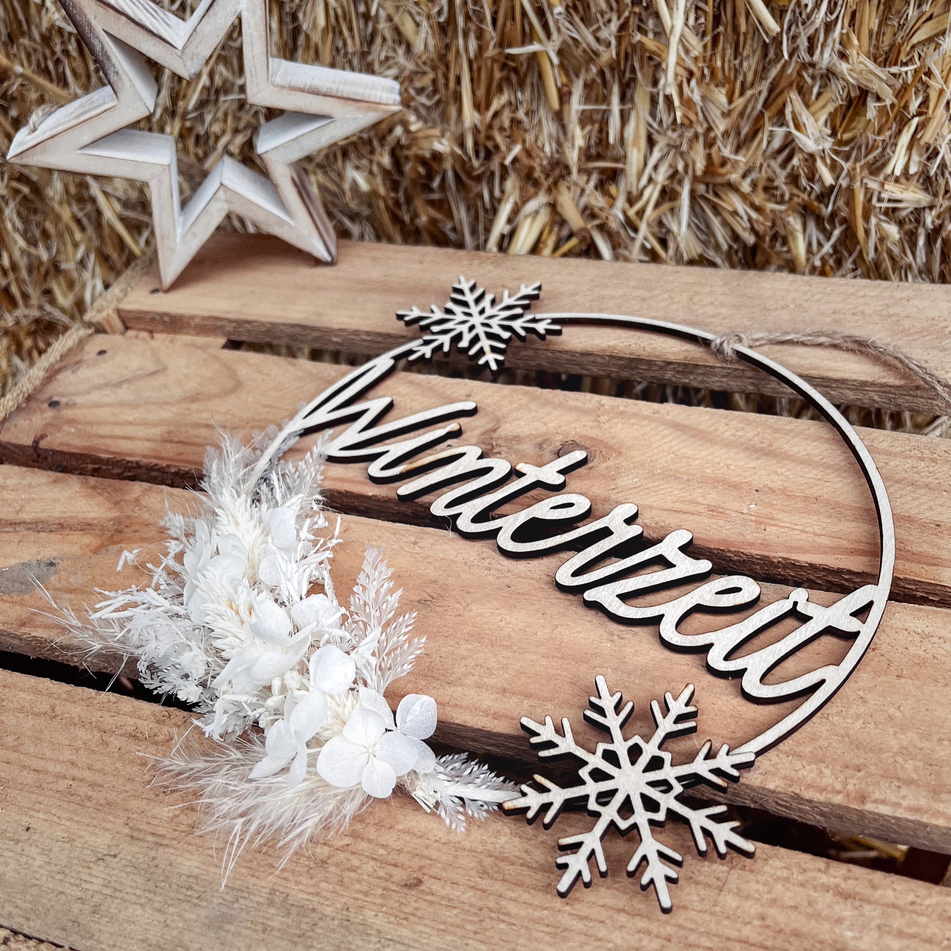 Begrüßen Sie die festliche Jahreszeit mit unserem stilvollen Türkranz „Winterzeit“. Dieser wunderschöne Kranz wird aus hochwertigem Holz präzise gelasert und kunstvoll mit liebevoll ausgewählten Trockenblumen sowie zarten Schneeflocken verziert. Jedes Detail dieses Kranzes spiegelt die Magie des Winters wider und schafft eine warme, einladende Atmosphäre für Ihr Zuhause.