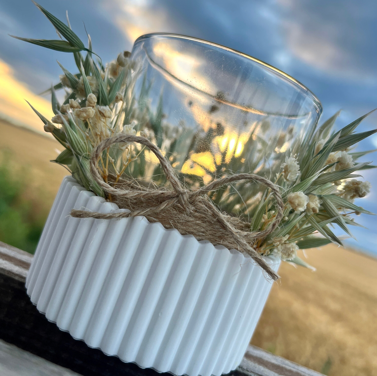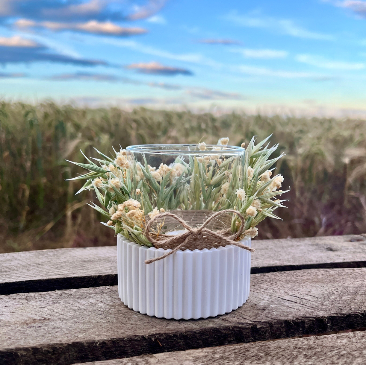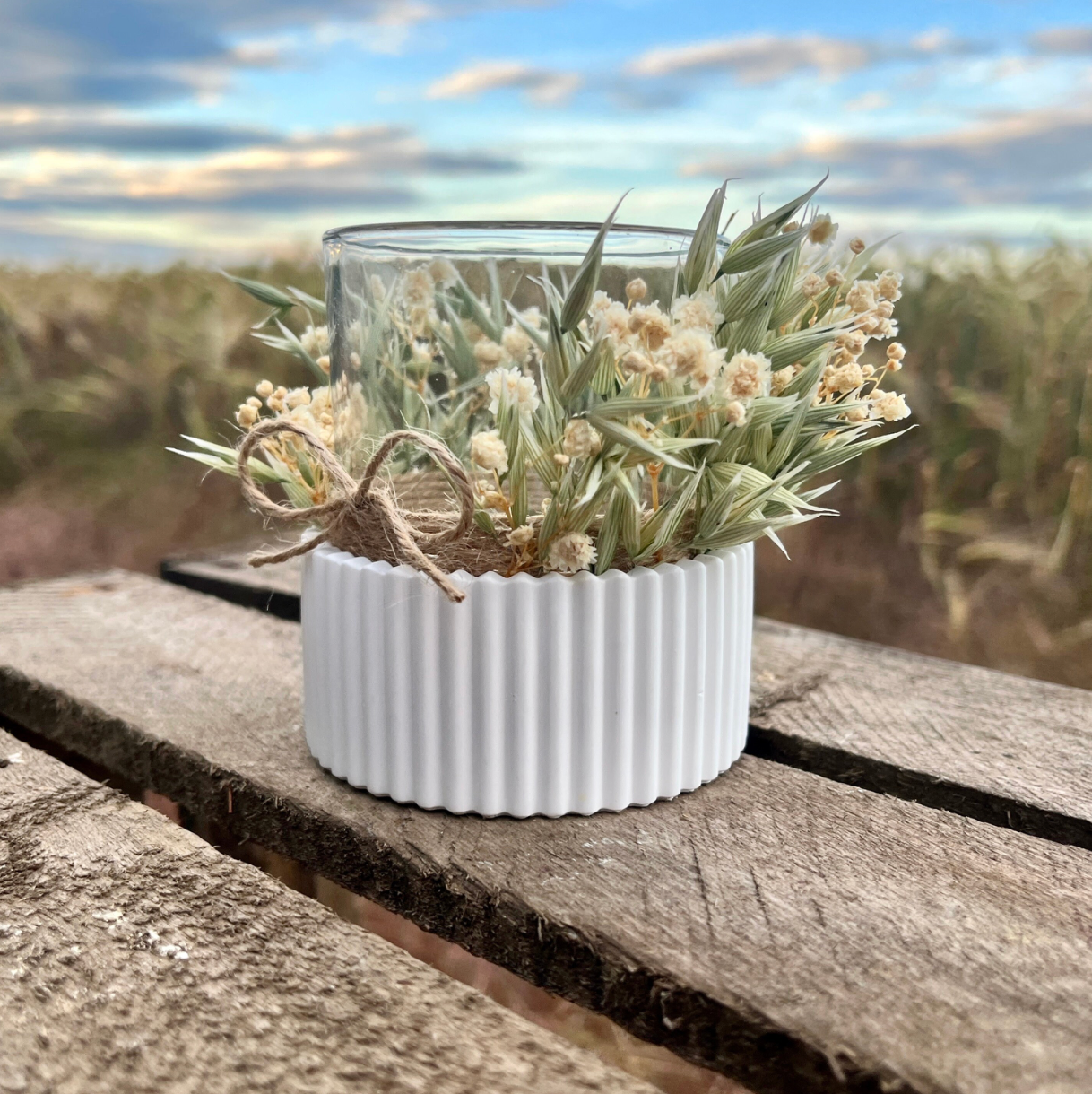 Dieses wunderschöne Windlicht eignet sich perfekt als Geschenk für jegliche Anlässe oder einfach nur zur stilvollen Dekoration im eigenen Zuhause. Es besteht aus einer handgegossenen Schale, die mit einem Kerzenglas und Trockenblumen wunderschön dekoriert ist.