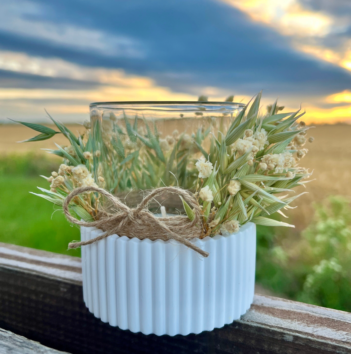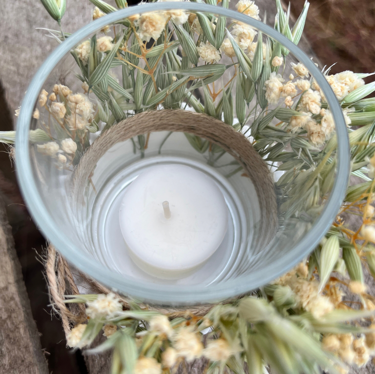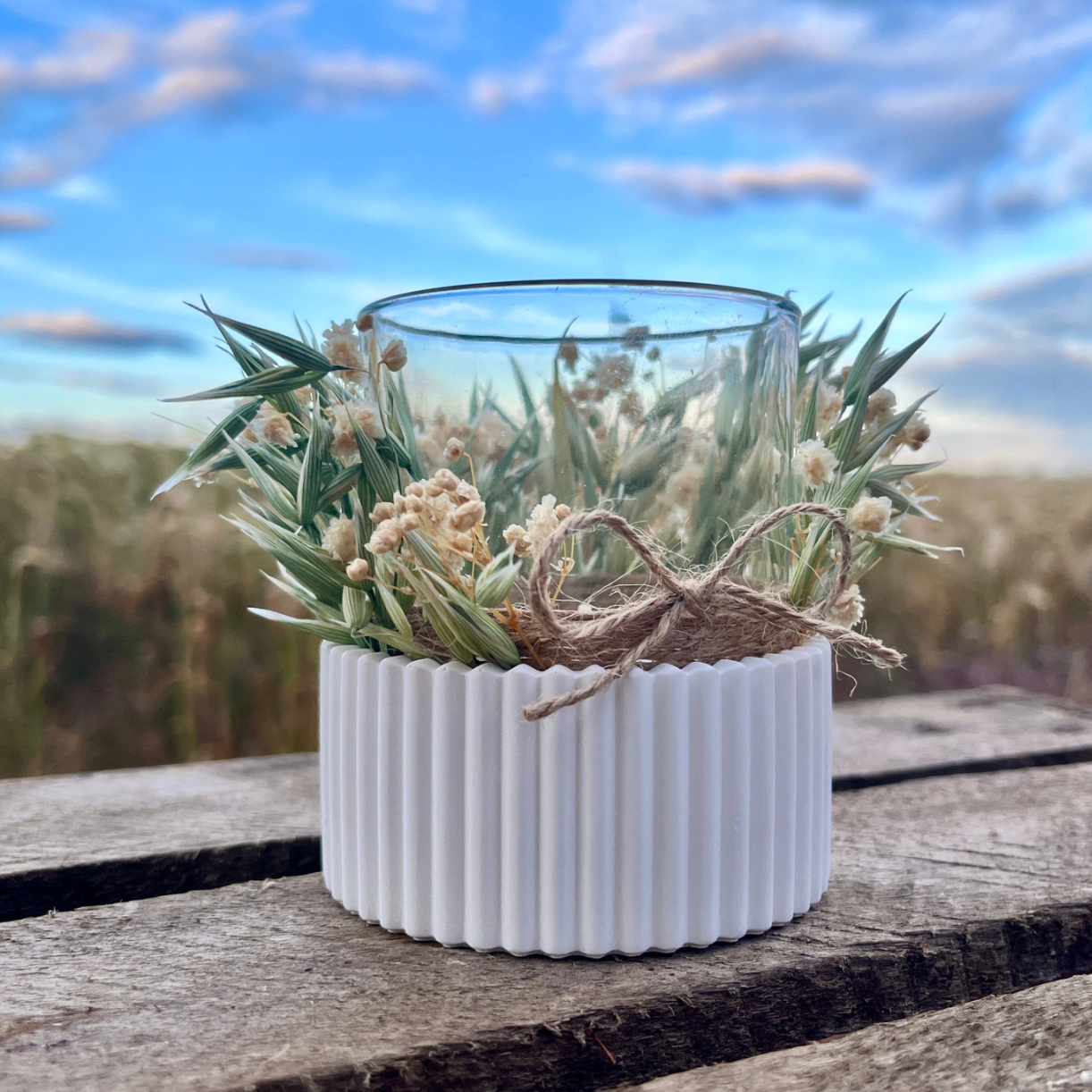 Dieses wunderschöne Windlicht eignet sich perfekt als Geschenk für jegliche Anlässe oder einfach nur zur stilvollen Dekoration im eigenen Zuhause. Es besteht aus einer handgegossenen Schale, die mit einem Kerzenglas und Trockenblumen wunderschön dekoriert ist.